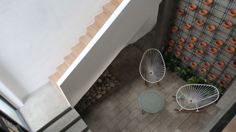 El interior de la casa recibe a sus habitantes con un vestíbulo vertical desde el cual las circulaciones se vuelven intuitivas al apreciarse las escaleras, el acceso discreto a zona de servicio y el pasillo descendente a la zona social, manteniendo siempre como impacto visual un muro de 6 metros de altura que alberga maceteras sin una disposición formal, para evitar la monotonía visual del recibidor.